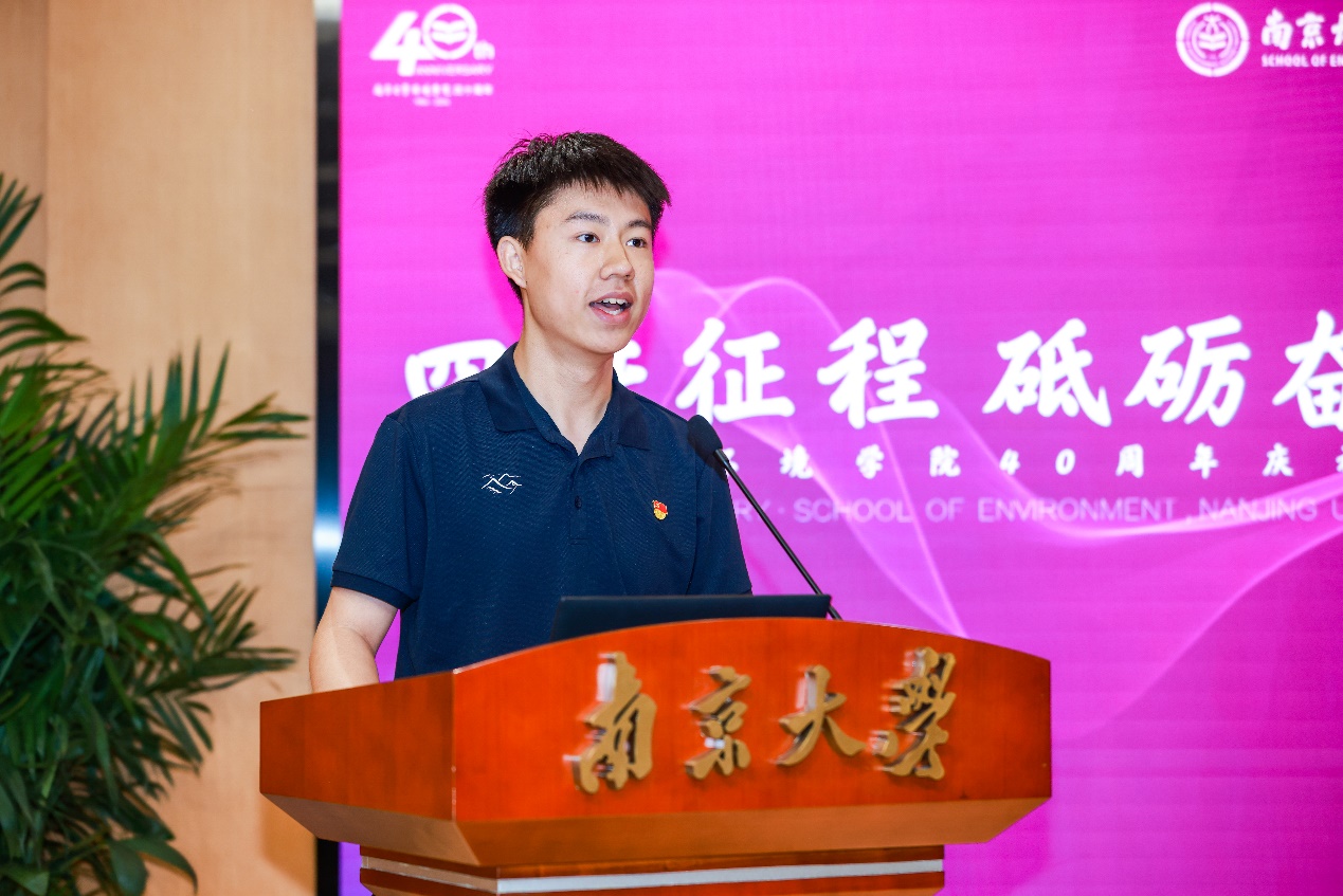 学生代表朱博阳分享了从本科到研究生阶段的学习经历和感受。他表示,学校和学院给学生们提供求知求学的广阔平台,让学生们在思想情操、意志品行、专业知识、实践能力等方面都收获了成长。作为一名南大环境人,将坚决贯彻落实习近平总书记"报效国家、服务人民"的核心要求,时刻牢记"再创佳绩、争做表率"的殷切期望,争先实干,砥砺奋进,为我国生态文明事业和美丽中国建设贡献青春力量。
