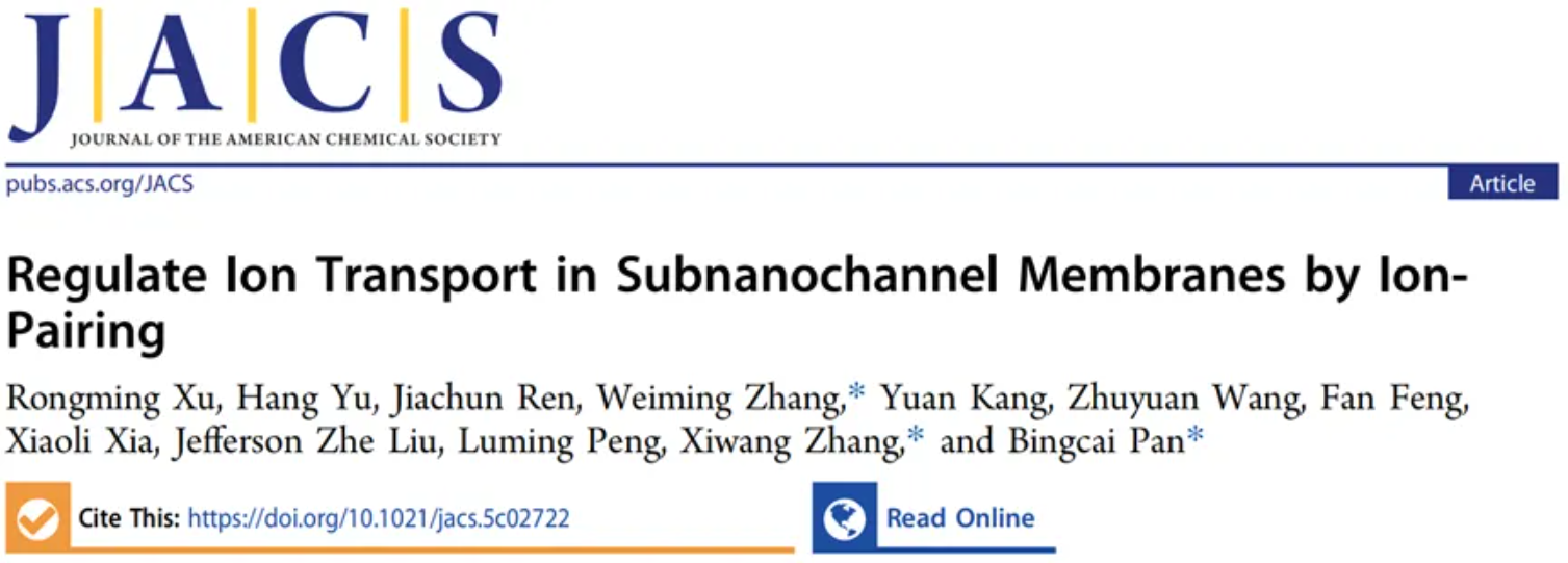 该研究工作以"Regulate Ion Transport in Sub-nanochannel Membrane by Ion-pairing"为题,发表在知名学术期刊Journal of the American Chemical Society上(原文链接://pubs.acs.org/doi/10.1021/jacs.5c02722)。团队博士后许荣明为论文的第一作者,张炜铭教授、张西旺教授(昆士兰大学)、潘丙才教授为通讯作者,团队博士生余航、硕士生任佳纯、莫纳什大学博士后康源、昆士兰大学博士后王祝愿、墨尔本大学刘哲教授、博士生冯帆、成人动漫 化学化工学院彭路明教授、博士生夏晓丽为共同作者。研究得到了国家自然科学基金(U22A20403, 21925602)、澳大利亚研究理事会ARC未来学者研究基金(FT210100593)、上海同济高廷耀青年博士生杰出人才奖学金以及中国科学院生态中心奥加诺(水质与水环境)奖学金资助。